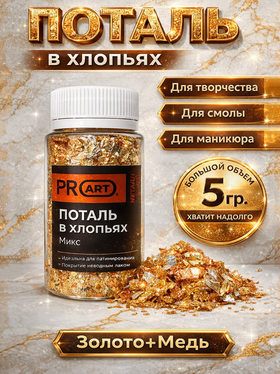 Поталь для творчества в хлопьях — простой способ добавить предметам благородный металлический блеск без сложных инструментов и опыта. Хлопья потали лёгкие, послушные в работе и быстро дают красивый, «дорогой» результат.