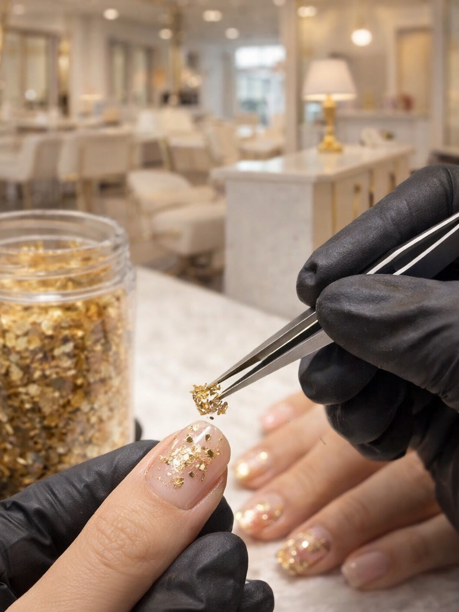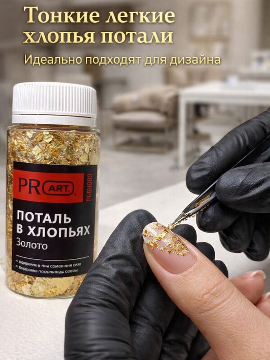 В маникюре поталь легко наносится на липкий слой гель-лака, на невысохший лак, на клей для золочения или просто замешивается в лак.
