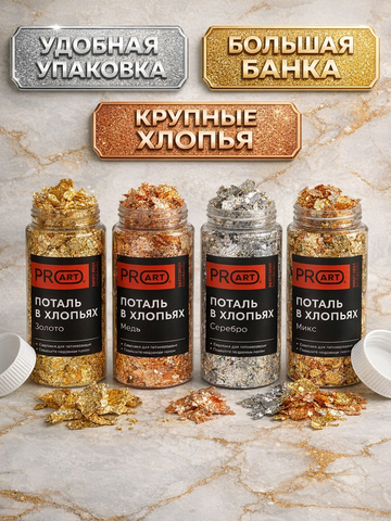 Поталь для творчества в хлопьях — простой способ добавить предметам благородный металлический блеск без сложных инструментов и опыта. Хлопья потали лёгкие, послушные в работе и быстро дают красивый, «дорогой» результат.