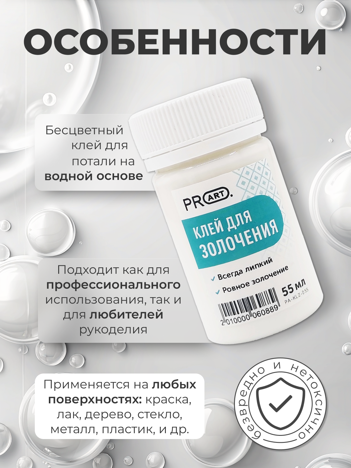Клей для золочения ProArt, 55мл. - надежный помощник в создании шедевров! Клей легко наносится и быстро высыхает, обеспечивая безупречную фиксацию листовой потали, хлопьев и ваты для золочения, трансферной фольги и сухих пигментов. Не требует специальных условий хранения и подходит как для профессионального использования, так и для любителей рукоделия.