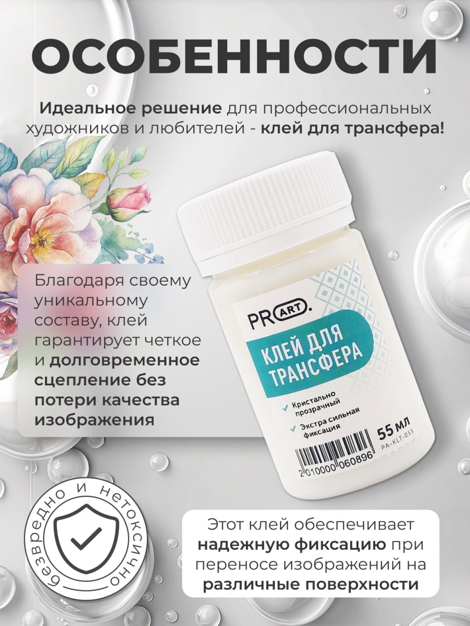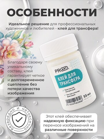 Клей для трансфера, 55мл, ProArt - идеальное решение для профессиональных художников и любителей. Этот клей обеспечивает надежную фиксацию при переносе изображений на различные поверхности. Благодаря своему уникальному составу, он гарантирует четкое и долговременное сцепление без потери качества изображения. Простое использование делает работу быстрой и эффективной.