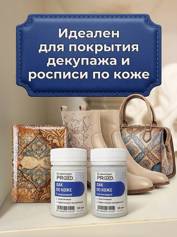 Прочное, гибкое и совершенно прозрачное покрытие, которое надёжно защищает декупаж и роспись на коже от трения и повседневных нагрузок, не трескается на сгибах и сохраняет свежий, аккуратный вид изделия надолго. Глянец — для яркого «лакового» эффекта, сатин — для сдержанного, благородного блеска.